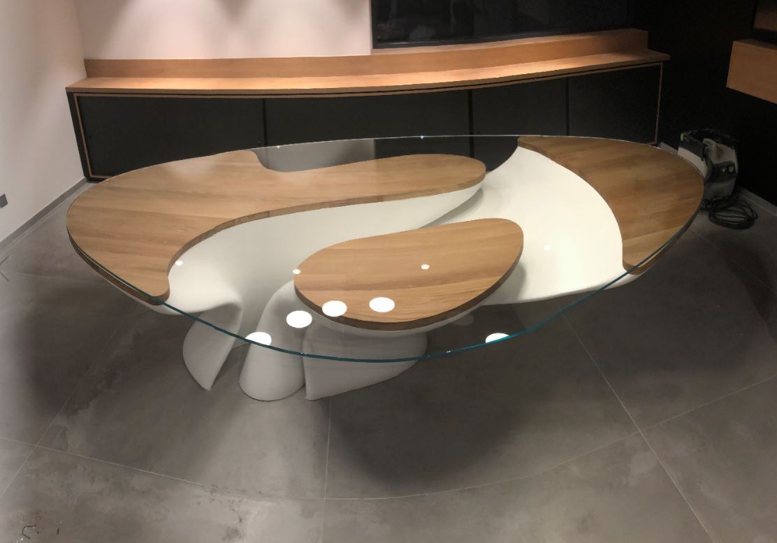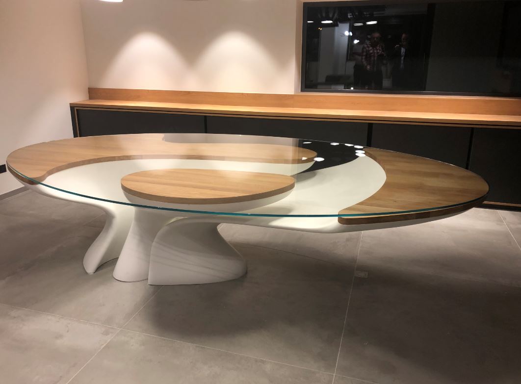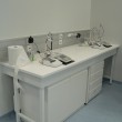 - Paillasse centrale fontaine et meuble vitrine verre émaillé